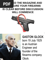 Section Name 1. Identification of Various Glock Parts 2. Exploded Schematic of a Glock Pistol with Parts List 3. Glock Field Strip Disassembly 4. Cleaning the Field Stripped Firearm 5. Lubrication Points 6. Slide Disassembly and Firing Pin Replacement 7. Firing Pin Safety Check 8. Glock Receiver Disassembly 9. Stock and New York Trigger Installation 10. Glock Magazine Disassembly 11. Magazine Catch Removal 12. Notes and Records 13. Close Quarters Combat - The Solution 14. Human Reaction Time On The Outcomes CQC