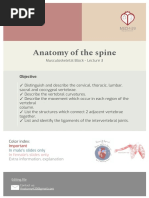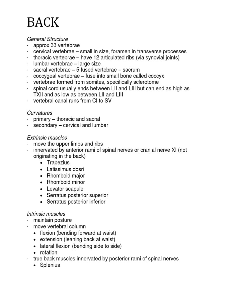 General Structure - approx 33 vertebrae - cervical vertebrae small in size, foramen in transverse processes - thoracic vertebrae have 12 articulated ribs (via synovial joints) - lumbar vertebrae large size - sacral vertebrae 5 fused vertebrae = sacrum - coccygeal vertebrae fuse into small bone called coccyx - vertebrae formed from somites, specifically sclerotome - spinal cord usually ends between LII and LIII but can end as high as TXII and as low as between LII and LIII - vertebral canal runs from CI to SV Curvatures - primary thoracic and sacral - secondary cervical and lumbar Extrinsic muscles - move the upper limbs and ribs - innervated by anterior rami of spinal nerves or cranial nerve XI (not originating in the back) Trapezius Latissimus dosri Rhomboid major Rhomboid minor Levator scapule Serratus posterior superior Serratus posterior inferior Intrinsic muscles - maintain posture - move vertebral column flexion (bending forward at waist) extension (leaning back at waist) lateral flexion (bending side to side) rotation - true back muscles innervated by posterior rami of spinal nerves Splenius