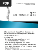 - may result in anterior slip of the vertebral body, compressing the vertebral canal - most common sites for this type of fracture are LIV and LV levels - in an oblique view of a lumbar vertebra radiograph, the tell tale Scottie dog is seen o transverse process = nose o pedicle = eye o superior articular process = ear o inferior articular process = front leg o pars interarticularis = neck - a fracture of the pars interarticularis is visible as a break in the neck of the dog or the appearance of a collar Spondylolisthesis - vertebra slips anteriorly onto its inferior counterpart without a pars interarticularis fracture - usually due to abnormal anatomy of the facet joints or facet joint degeneration Spondylolysis - fracture of pars interarticularis Spondylosis - degenerative osteoarthritis of vertebral joints Ankylosing spondylitis - bony growth of vertebral body leading to disfunction Nerve injuries in back - trapezius due to interruption in accessory nerve may appear as drooping of shoulder, inability to raise arm above the head, inability to shrug shoulder against resistance - latissimus dosri injury to thoracodorsal nerve diminished capacity to pull the body upward (do a pull up) - rhomboids injury to the dorsal scapular nerve lateral shift in the position of the scapula affected because ability to hold it in place is lost Lumbar puncture (spinal tap) - needle passes through skin fat layer thoracolumbar fascia erector spinae muscles between adjacent vertebral spinous