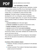 increases strength of vertebral body and prevents future loss of height generates some heat which may disrupt pain at nerve endings Scoliosis - abnormal lateral curvature of the vertebral column - can be a diagnosing tool for other diseases including muscular dystrophy Kyphosis - abnormal curvature of vertebral column in thoracic region - hunchback deformity - gibbus deformity abnormal curvature at site of tuberculosis infection Lordosis - abnormal curvature of vertebral column in lumbar region - swayback deformity Variation in vertebral numbers - fusion of CI and CII is known as Klippel-Feil syndrome and may be associated with high riding scapula (Sprengels shoulder) and cardiac abnormalities - hemivertebra are vertebra that develop only on one side Osteoporosis - bone quality is normal but quantity of bone is deficient - influenced by many factors in particular estrogen levels Herniated discs - tear in annulus fibrosus is where nucleus pulposus can track through and impinge on nerves - posterolaterl herniated discs will impinge on the descending root ex) herniated disc between L4 and L5, which nerve is pinched? L5 - fully lateral herniation will result in impingement of upper spinal nerve root in pair Vertebral fractures - if a traumatic incident disrupts craniocervial stability the changes of a significant spinal cord injury are extremely high consequences are quadriplegia in short term you may lose breathing function due to injury of phrenic nerve at C3 to C5 innervates diaphragm muscle - below level of C5 respiratory function is unlikely to be compromised Pars interarticularis fractures - fracture that occurs between the superior and inferior articular facet (zygapophysial) joints