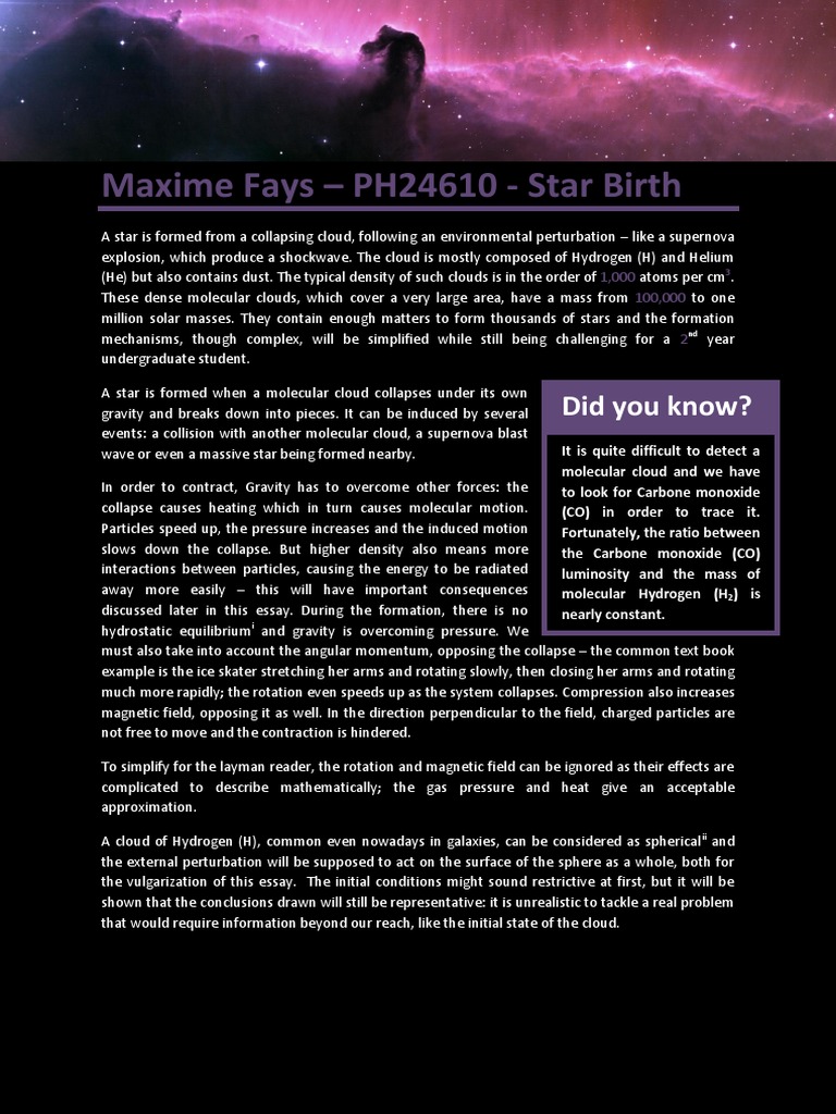 A star is formed from a collapsing cloud, following an environmental perturbation like a supernova explosion, which produce a shockwave. The cloud is mostly composed of Hydrogen (H) and Helium (He) but also contains dust. The typical density of such clouds is in the order of 1,000 atoms per cm3. These dense molecular clouds, which cover a very large area, have a mass from 100,000 to one million solar masses. They contain enough matters to form thousands of stars and the formation mechanisms, though complex, will be simplified while still being challenging for a 2nd year undergraduate student. A star is formed when a molecular cloud collapses under its own gravity and breaks down into pieces. It can be induced by several events: a collision with another molecular cloud, a supernova blast wave or even a massive star being formed nearby.