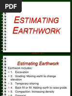 The quantity takeoff of excavation is in cubic feet and converted to cubic yards. The estimator needs to establish if bank yards or swelled yards are being used in the calculations. A bankyard is the measurement of the soil, as it lies undisturbed in the ground. When the soil is excavated it will expand and assume a larger volume. This expansion is called the swell factor. It is measured as a percentage increase above the undisturbed volume. Once excavated soil is placed and compacted on the project, it will be compressed into a smaller volume. The degree of compaction and the type of soil will affect the amount of shrinkage. The estimator needs to compensate for swell and shrinkage when hauling earth off the site or bringing additional material and compacting it on the site. The swell and shrinkage factors vary greatly depending on the type of material. The estimator should refer to the soils report to determine the exact swell and/or shrinkage 1 of 25