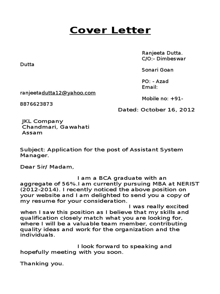 Ranjeeta Dutta. C/O:- Dimbeswar Dutta Sonari Goan PO: - Azad Email: ranjeetadutta12@yahoo.com Mobile no: +918876623873 Dated: October 16, 2012 JKL Company Chandmari, Gawahati Assam Subject: Application for the post of Assistant System Manager. Dear Sir/ Madam, I am a BCA graduate with an aggregate of 56%.I am currently pursuing MBA at NERIST (2012-2014). I recently noticed the above position on your website and I am delighted to send you a copy of my resume for your consideration. I was really excited when I saw this position as I believe that my skills and qualification closely match what you are looking for, where I will be a valuable team member, contributing quality ideas and work for the organization and the individuals. I look forward to speaking and hopefully meeting with you soon. Thanking you.