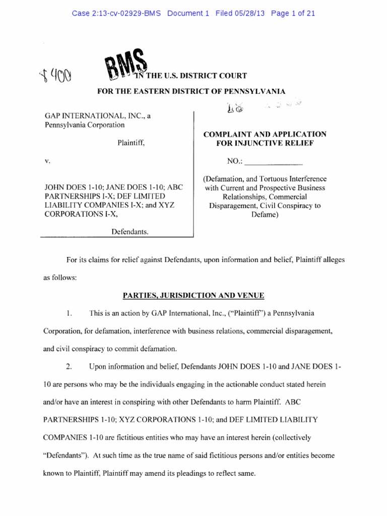 Gap International Complaint Against John Does Federal Complaint
