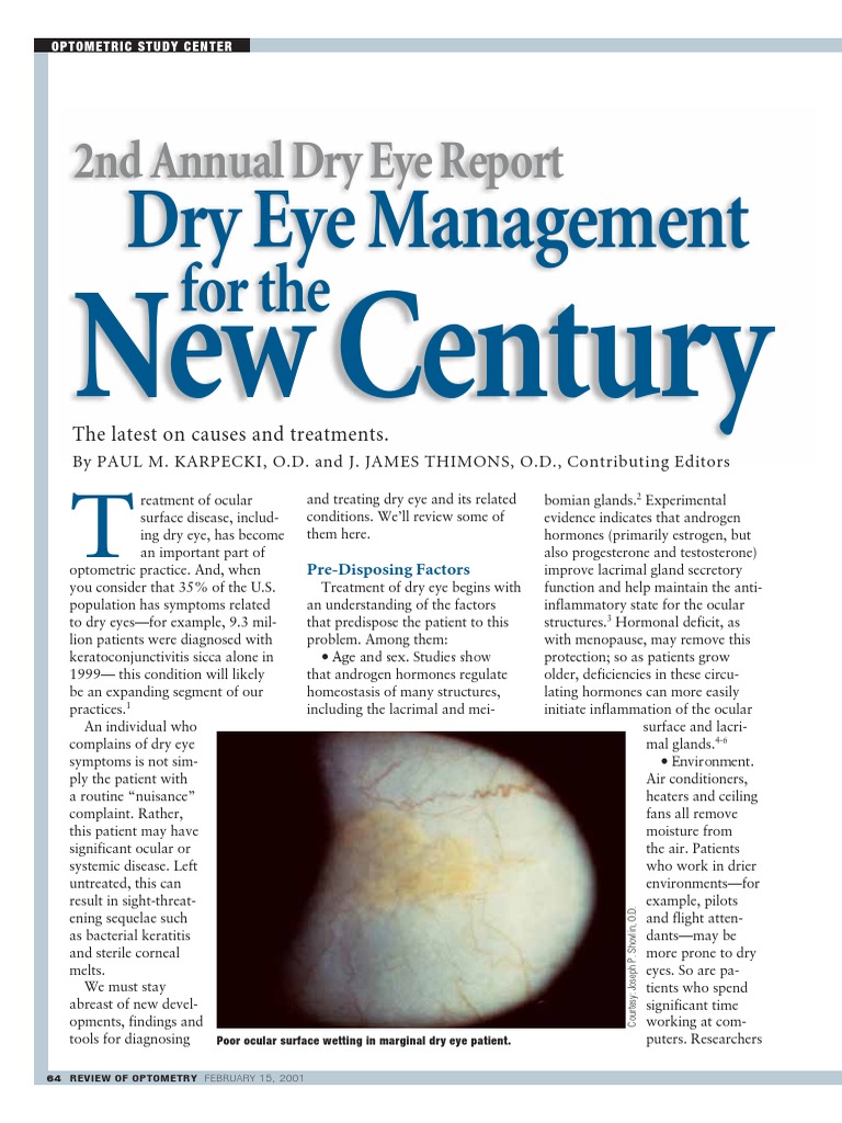 bid for 6 months showed a significant increase in goblet cell density, a decrease of T-lymphocytes and a corresponding improvement in patient symptoms, im proved rose Bengal staining and superficial punctate keratitis.36 Androgen medications. As we mentioned, androgen hormones appear to improve lacrimal gland secretory function and help maintain the anti-inflammatory state for the ocular structures. Over the next few years, we may begin to see treatments that focus on hormonal regulation. Nutrition. Research suggests that dietary supplementation with omega-3 and other polyunsaturated fatty acids may help decrease proinflam - matory cytokines and lessen the severity of Sjgrens syndrome, but more research is probably needed.37 N.A. Brown and colleagues believe that gamma-linolenic acid, one of the essential fatty acids, may relieve symptoms of Sjgrens syndrome and other dry eye conditions.38 The newest research in dry eye pathology focuses on the underlying causes, multiple tests and new treatments. Armed with this information, dry eye syndrome, one of the most common diseases we see in optometric practice, will become easier to diagnose and treat. Proper diagnosis assists the chronic dry eye patient and will prevent severe sight-threatening pathology such as bacterial keratitis and corneal melts. n Dr. Karpecki is the medical director for cataract, refractive surgery and anterior segment disease at Hunkeler Eye Centers, a NovaMed EyeCare Management practice, in Kansas City, Mo. Dr. Thimons is executive director of TLC and Ophthalmic Consultants of Connecticut. Both are regular columnists for Review of Optometry.
