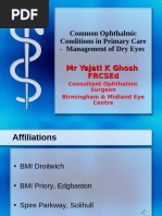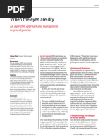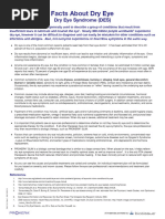 Many patients report much greater comfort when using these devices. Collagen plugs that last 3-7 days are certainly easier to insert, but usually yield little change in symptoms over a 3-day period. The advent of new 2-week dissolving plugs may be a significant improvement and a great consideration for post-LASIK patients. Silicone plugs appear to be the most effective punctal occlusion device because they block a greater amount of outflow tears and do not dissolve.30 Some clinicians recommend upper punctal Cyclosporin inhibits inflammatory cytokine producocclusion in patients with tion and may one day allow longer-term use without chronic blepharitis or the potential side effects of steroids. significant inflammation, such as with rheumatoid arthritis. These clinicians elderly, arthritic patients who lack postulate that patients with blephathe dexterity to instill artificial tears ritis, upper occlusion allows the regularly.) Staphylococ cus to accumulate in Patients who use less than 4 the lower lid margin to wash away drops a day or experience occamore easily through an open lower punctum. sional dryness in their eyes should probably use preserved tears beAlternative Treatments cause these patients are more likely Besides some of these traditional to leave the bottle around for long dry eye treatments, many alternaperiods of time. tive therapies are in the pipeline. Ointments are better suited as a Among them: nighttime lubricant or for patients Corticosteroids. Many cliniwith significant vision loss. Of cians are starting to consider course, because ointments comcorticosteroids effective treatments promise vision, their daytime use is for dry eye because corticostelimited. roids can inhibit most inflammaGels offer greater contact time tory pathways, including cytokine than drops without the visual comproduction, cell adhesion molecules promise of ointments. However, and vascular permeability. In fact a they also dont have the contact time of an ointment. Again, we cau- study by P. Prabhasawat and S.C. tion their use in patients with severe Tseng showed an 83% subjective improvement in symptoms and dry eye because the disappearing an 80% improvement in certain preservative has the rare chance to clinical observations with a 2-week cause mild toxicity in this type of regimen of prednisolone 1% qid.31 patient, particularly one atopic in 29 While steroids are generally good nature. for short-term use, dry eye is a Punctal Occlusion chronic condition. Remember, long70 REVIEW OF OPTOMETRY february 15, 2001