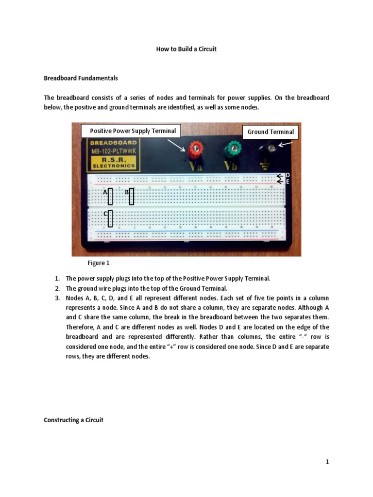 Figure 1 1. The power supply plugs into the top of the Positive Power Supply Terminal. 2. The ground wire plugs into the top of the Ground Terminal. 3. Nodes A, B, C, D, and E all represent different nodes. Each set of five tie points in a column represents a node. Since A and B do not share a column, they are separate nodes. Although A and C share the same column, the break in the breadboard between the two separates them. Therefore, A and C are different nodes as well. Nodes D and E are located on the edge of the breadboard and are represented differently. Rather than columns, the entire - row is considered one node, and the entire + row is considered one node. Since D and E are separate rows, they are different nodes.