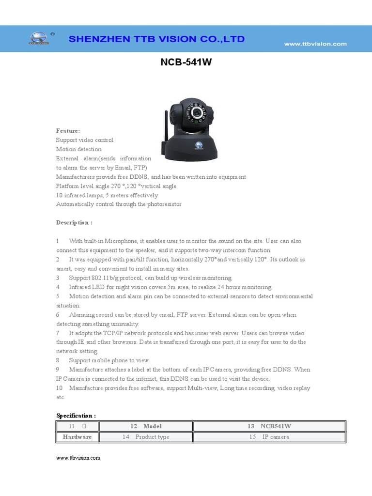 Feature: Support video control Motion detection External alarm(sends information to alarm the server by Email, FTP) Manufacturers provide free DDNS, and has been written into equipment Platform level angle 270 ,120 vertical angle 10 infrared lamps, 5 meters effectively Automatically control through the photoresistor Description : 1 With built-in Microphone, it enables user to monitor the sound on the site. User can also connect this equipment to the speaker, and it supports two-way intercom function. 2 It was equipped with pan/tilt function, horizontally 270and vertically 120. Its outlook is smart, easy and convenient to install in many sites. 3 Support 802.11b/g protocol, can build up wireless monitoring. 4 Infrared LED for night vision covers 5m area, to realize 24 hours monitoring. 5 Motion detection and alarm pin can be connected to external sensors to detect environmental situation. 6 Alarming record can be stored by email, FTP server. External alarm can be open when detecting something unusuality. 7 It adopts the TCP/IP network protocols and has inner web server. Users can browse video through IE and other browsers. Data is transferred through one port; it is easy for user to do the network setting. 8 Support mobile phone to view. 9 Manufacture attaches a label at the bottom of each IP Camera, providing free DDNS. When IP Camera is connected to the internet, this DDNS can be used to visit the device. 10 Manufacture provides free software, support Multi-view, Long time recording, video replay etc. Specification : 11 12 Model 14 Product type 13 NCB541W Hardware
