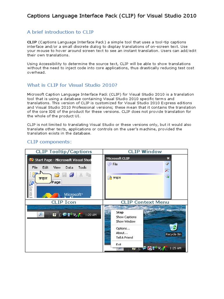Microsoft Caption Language Interface Pack (CLIP) for Visual Studio 2010 is a translation tool that is using a database containing Visual Studio 2010 specific terms and translations. This version of CLIP is customized for Visual Studio 2010 Express editions and Visual Studio 2010 Professional versions; these mean that it contains the translation of the core IDE of the product for these versions. CLIP does not provide translation for the whole of the product UI. CLIP is not limited to translating Visual Studio or these versions only, but it would also translate other texts, applications or controls on the users machine, provided the translation exists in the database.