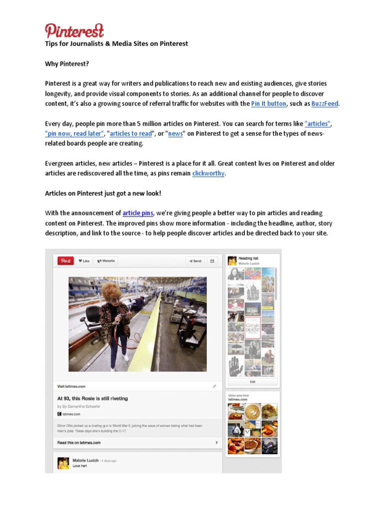Resources Special thanks to the following people who have written about great examples of how journalists and media companies are using Pinterest. Weve included some of their examples and tips in this guide. - Steve Buttry of The Buttry Diary (how journalists can use Pinterest) - Mallary Jean Tenore of Poynter (5 ways journalists are using Pinterest) - Katrina M Mendolera of inVocus (Journalists on Pinterest) More info from Pinterest: Article pins blog post More info about article pins on our business blog Technical info on article pins Pinterest board of tips for writers Pinterest board of tips for media sites