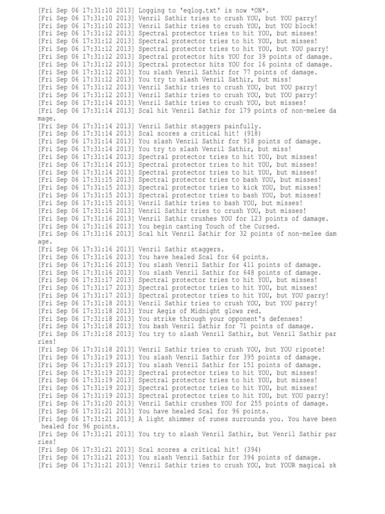 Sep 06 17:31:50 2013] Spectral protector tries to hit YOU, but YOU riposte! Sep 06 17:31:50 2013] Spectral protector tries to hit YOU, but YOU dodge! Sep 06 17:31:50 2013] You slash spectral protector for 648 points of damage Sep 06 17:31:50 2013] Spectral protector tries to hit YOU, but YOU riposte! Sep 06 17:31:51 2013] Scal scores a critical hit! (1256) Sep 06 17:31:51 2013] You slash spectral protector for 1256 points of damag