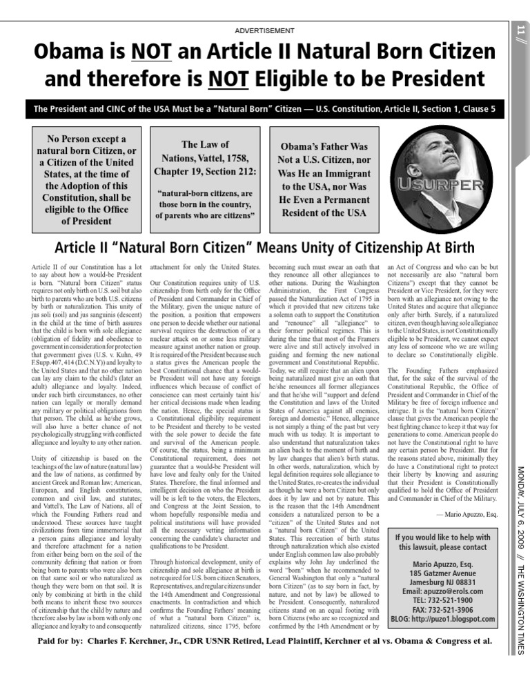 06 Jul 2009: Kerchner et al v Obama & Congress et al Advertorial in 20090706 Issue Wash Times on page 11. Obama is NOT an Article II Natural Born Citizen and therefore is NOT eligible to be President.
