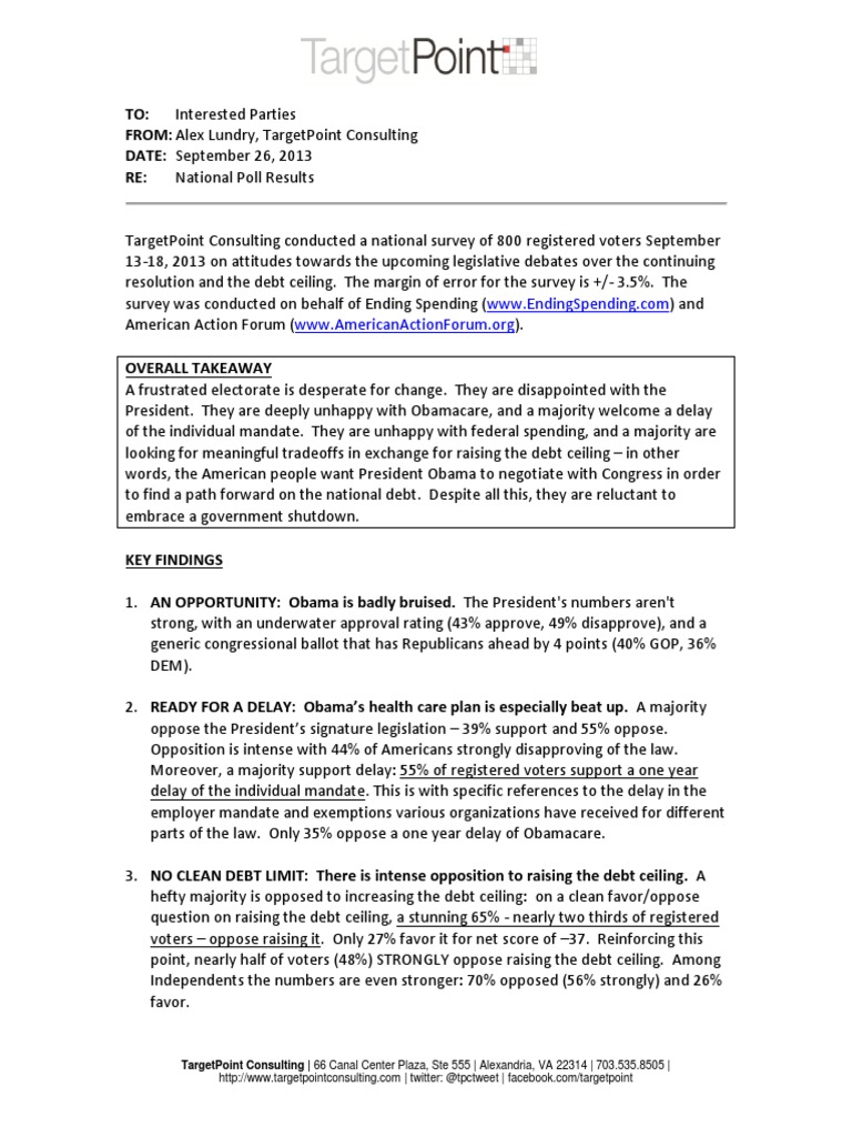 TargetPoint Consulting conducted a national survey of 800 registered voters September 13-18, 2013 on attitudes towards the upcoming legislative debates over the continuing resolution and the debt ceiling. The margin of error for the survey is +/- 3.5%. The survey was conducted on behalf of Ending Spending (www.EndingSpending.com) and American Action Forum (www.AmericanActionForum.org). OVERALL TAKEAWAY A frustrated electorate is desperate for change. They are disappointed with the President. They are deeply unhappy with Obamacare, and a majority welcome a delay of the individual mandate. They are unhappy with federal spending, and a majority are looking for meaningful tradeoffs in exchange for raising the debt ceiling in other words, the American people want President Obama to negotiate with Congress in order to find a path forward on the national debt. Despite all this, they are reluctant to embrace a government shutdown. KEY FINDINGS 1. AN OPPORTUNITY: Obama is badly bruised. The President's numbers aren't strong, with an underwater approval rating (43% approve, 49% disapprove), and a generic congressional ballot that has Republicans ahead by 4 points (40% GOP, 36% DEM). 2. READY FOR A DELAY: Obamas health care plan is especially beat up. A majority oppose the Presidents signature legislation 39% support and 55% oppose. Opposition is intense with 44% of Americans strongly disapproving of the law. Moreover, a majority support delay: 55% of registered voters support a one year delay of the individual mandate. This is with specific references to the delay in the employer mandate and exemptions various organizations have received for different parts of the law. Only 35% oppose a one year delay of Obamacare. 3. NO CLEAN DEBT LIMIT: There is intense opposition to raising the debt ceiling. A hefty majority is opposed to increasing the debt ceiling: on a clean favor/oppose question on raising the debt ceiling, a stunning 65% - nearly two thirds of registered voters oppose raising it. Only 27% favor it for net score of 37. Reinforcing this point, nearly half of voters (48%) STRONGLY oppose raising the debt ceiling. Among Independents the numbers are even stronger: 70% opposed (56% strongly) and 26% favor.