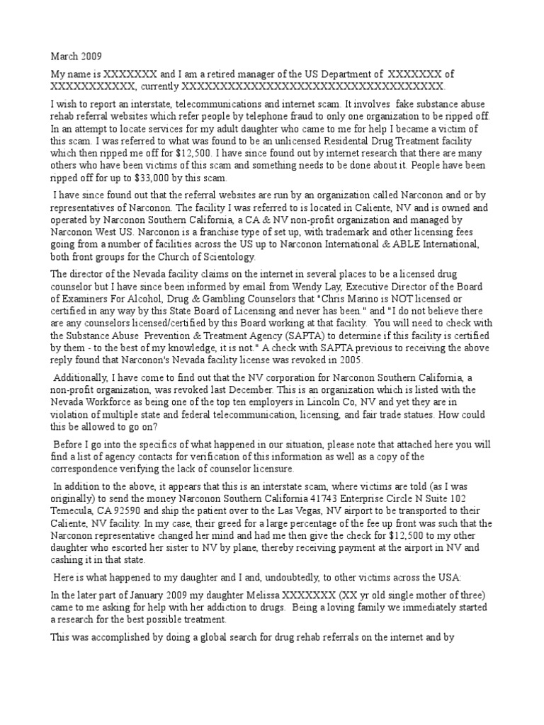 March 2009My name is XXXXXXX and I am a retired manager of the US Department of XXXXXXX of XXXXXXXXXXX, currently XXXXXXXXXXXXXXXXXXXXXXXXXXXXXXXXXX. I wish to report an interstate, telecommunications and internet scam. It involves fake substance abuse rehab referral websites which refer people by telephone fraud to only one organization to be ripped off. In an attempt to locate services for my adult daughter who came to me for help I became a victim of this scam. I was referred to what was found to be an unlicensed Residental Drug Treatment facility which then ripped me off for $12,500. I have since found out by internet research that there are many others who have been victims of this scam and something needs to be done about it. People have been ripped off for up to $33,000 by this scam. I have since found out that the referral websites are run by an organization called Narconon and or by representatives of Narconon. The facility I was referred to is located in Caliente, NV and is owned and operated by Narconon Southern California, a CA & NV non-profit organization and managed by Narconon West US. Narconon is a franchise type of set up, with trademark and other licensing fees going from a number of facilities across the US up to Narconon International & ABLE International, both front groups for the Church of Scientology.The director of the Nevada facility claims on the internet in several places to be a licensed drug counselor but I have since been informed by email from Wendy Lay, Executive Director of the Board of Examiners For Alcohol, Drug & Gambling Counselors that "Chris Marino is NOT licensed or certified in any way by this State Board of Licensing and never has been." and "I do not believe there are any counselors licensed/certified by this Board working at that facility. You will need to check with the Substance Abuse Prevention & Treatment Agency (SAPTA) to determine if this facility is certified by them - to the best of my knowledge, it is not." A check with SAPTA previous to receiving the above reply found that Narconon's Nevada facility license was revoked in 2005. Additionally, I have come to find out that the NV corporation for Narconon Southern California, a non-profit organization, was revoked last December. This is an organization which is listed with the Nevada Workforce as being one of the top ten employers in Lincoln Co, NV and yet they are in violation of multiple state and federal telecommunication, licensing, and fair trade statues. How could this be allowed to go on? Before I go into the specifics of what happened in our situation, please note that attached here you will find a list of agency contacts for verification of this information as well as a copy of the correspondence verifying the lack of counselor licensure. In addition to the above, it appears that this is an interstate scam, where victims are told (as I was originally) to send the money Narconon Southern California 41743 Enterprise Circle N Suite 102 Temecula, CA 92590 and ship the patient over to the Las Vegas, NV airport to be transported to their Caliente, NV facility. In my case, their greed for a large percentage of the fee up front was such that the Narconon representative changed her mind and had me then give the check for $12,500 to my other daughter who escorted her sister to NV by plane, thereby receiving payment at the airport in NV and cashing it in that state. Here is what happened to my daughter and I and, undoubtedly, to other victims across the USA:In the later part of January 2009 my daughter Melissa XXXXXXX (XX yr old single mother of three) came to me asking for help with her addiction to drugs. Being a loving family we immediately started a research for the best possible treatment.This was accomplished by doing a global search for drug rehab referrals on the internet and by