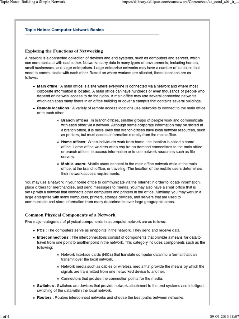A network is a connected collection of devices and end systems, such as computers and servers, which can communicate with each other. Networks carry data in many types of environments, including homes, small businesses, and large enterprises. Large enterprise networks may have a number of locations that need to communicate with each other. Based on where workers are situated, these locations are as follows: Main office : A main office is a site where everyone is connected via a network and where most corporate information is located. A main office can have hundreds or even thousands of people who depend on network access to do their jobs. A main office may use several connected networks, which can span many floors in an office building or cover a campus that contains several buildings. Remote locations : A variety of remote access locations use networks to connect to the main office or to each other. Branch offices: In branch offices, smaller groups of people work and communicate with each other via a network. Although some corporate information may be stored at a branch office, it is more likely that branch offices have local network resources, such as printers, but must access information directly from the main office. Home offices: When individuals work from home, the location is called a home office. Home-office workers often require on-demand connections to the main office or branch offices to access information or to use network resources such as file servers. Mobile users: Mobile users connect to the main office network while at the main office, at the branch office, or traveling. The location of the mobile users determines their network access requirements. You may use a network in your home office to communicate via the Internet in order to locate information, place orders for merchandise, and send messages to friends. You may also have a small office that is set up with a network that connects other computers and printers in the office. Similarly, you may work in a large enterprise with many computers, printers, storage devices, and servers that are used to communicate and store information from many departments over large geographic areas.