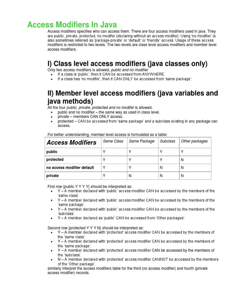 First row {public Y Y Y Y} should be interpreted as: Y A member declared with public access modifier CAN be accessed by the members of the same class. Y A member declared with public access modifier CAN be accessed by the members of the same package. Y A member declared with public access modifier CAN be accessed by the members of the subclass. Y A member declared as public CAN be accessed from Other packages. Second row {protected Y Y Y N} should be interpreted as: Y A member declared with protected access modifier CAN be accessed by the members of the same class. Y A member declared with protected access modifier CAN be accessed by the members of the same package. Y A member declared with protected access modifier CAN be accessed by the members of the subclass. N A member declared with protected access modifier CANNOT be accessed by the members of the Other package. similarly interpret the access modifiers table for the third (no access modifier) and fourth (private access modifier) records.