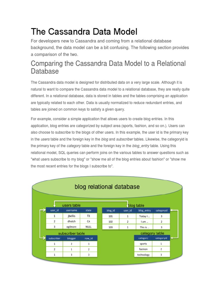 The Cassandra data model is designed for distributed data on a very large scale. Although it isnatural to want to compare the Cassandra data model to a relational database, they are really quitedifferent. In a relational database, data is stored in tables and the tables comprising an applicationare typically related to each other. Data is usually normalized to reduce redundant entries, andtables are joined on common keys to satisfy a given query.For example, consider a simple application that allows users to create blog entries. In thisapplication, blog entries are categorized by subject area (sports, fashion, and so on.). Users canalso choose to subscribe to the blogs of other users. In this example, the user id is the primary keyin the