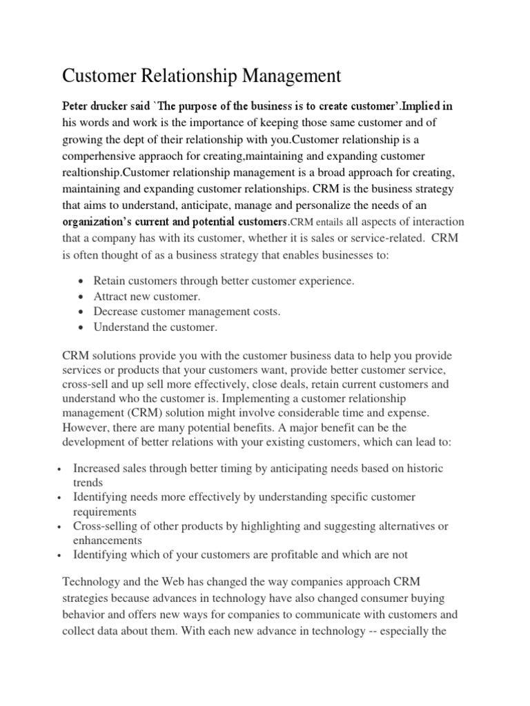 Peter drucker said `The purpose of the business is to create customer.Implied in his words and work is the importance of keeping those same customer and of growing the dept of their relationship with you.Customer relationship is a comperhensive appraoch for creating,maintaining and expanding customer realtionship.Customer relationship management is a broad approach for creating, maintaining and expanding customer relationships. CRM is the business strategy that aims to understand, anticipate, manage and personalize the needs of an organizations current and potential customers.CRM entails all aspects of interaction that a company has with its customer, whether it is sales or service-related. CRM is often thought of as a business strategy that enables businesses to: Retain customers through better customer experience. Attract new customer. Decrease customer management costs. Understand the customer.
