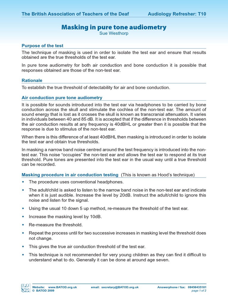 Sue Westhorp Purpose of the test The technique of masking is used in order to isolate the test ear and ensure that results obtained are the true thresholds of the test ear. In pure tone audiometry for both air conduction and bone conduction it is possible that responses obtained are those of the non-test ear. Rationale To establish the true threshold of detectability for air and bone conduction. Air conduction pure tone audiometry It is possible for sounds introduced into the test ear via headphones to be carried by bone conduction across the skull and stimulate the cochlea of the non-test ear. The amount of sound energy that is lost as it crosses the skull is known as transcranial attenuation. It varies in individuals between 40 and 85 dB. It is accepted that if the difference in thresholds between the air conduction results at any frequency is 40dBHL or greater then it is possible that the response is due to stimulus of the non-test ear. When there is this difference of at least 40dBHL then masking is introduced in order to isolate the test ear and obtain true thresholds. In masking a narrow band noise centred around the test frequency is introduced into the nontest ear. This noise occupies the non-test ear and allows the test ear to respond at its true threshold. Pure tones are presented into the test ear in the usual way until a true threshold can be recorded. Masking procedure in air conduction testing (This is known as Hoods technique) The procedure uses conventional headphones. The adult/child is asked to listen to the narrow band noise in the non-test ear and indicate when it is just audible. Increase the level by 20dB. Instruct the adult/child to ignore this noise and listen for the signal. Using the usual 10 down 5 up method, re-measure the threshold of the test ear. Increase the masking level by 10dB. Re-measure the threshold. Repeat the process until for two successive increases in masking level the threshold does not change. This gives the true air conduction threshold of the test ear. This technique is not recommended for very young children as they can find it difficult to understand what to do. Generally it can be done at around age seven.