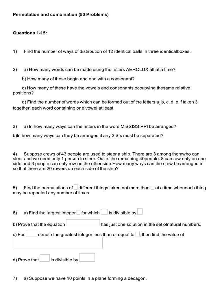 12) Find the number of ways in which an examiner can assign 30 marks to 8 questions, giving not less than 2 marks to any question.