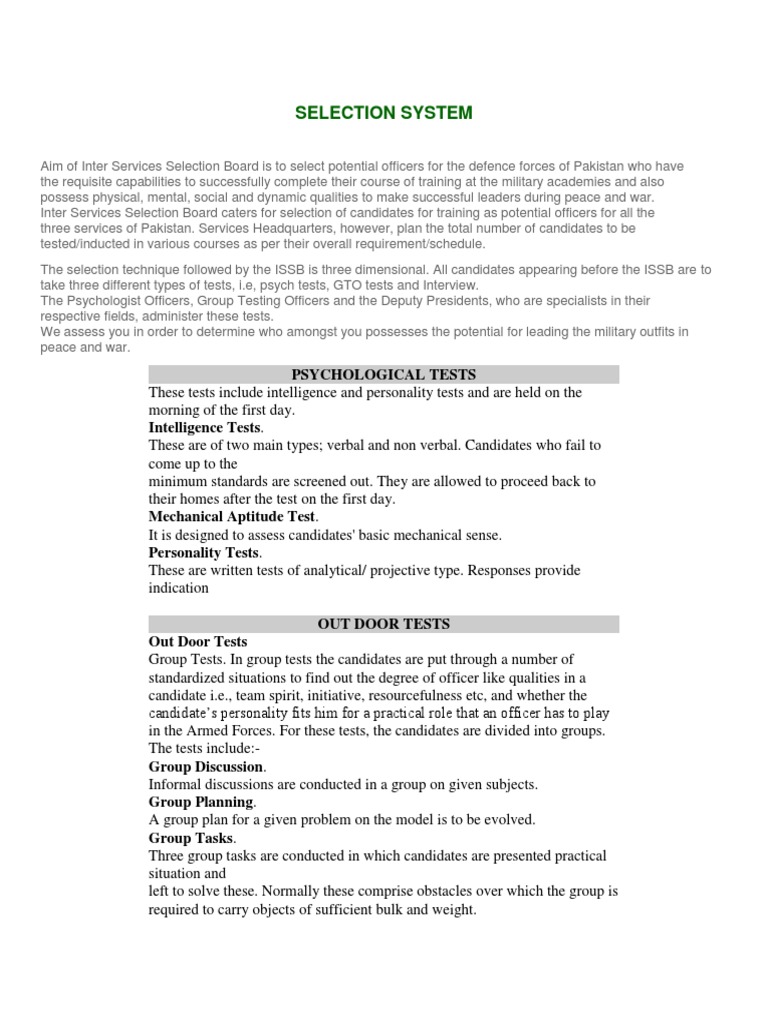 Aim of Inter Services Selection Board is to select potential officers for the defence forces of Pakistan who have the requisite capabilities to successfully complete their course of training at the military academies and also possess physical, mental, social and dynamic qualities to make successful leaders during peace and war. Inter Services Selection Board caters for selection of candidates for training as potential officers for all the three services of Pakistan. Services Headquarters, however, plan the total number of candidates to be tested/inducted in various courses as per their overall requirement/schedule. The selection technique followed by the ISSB is three dimensional. All candidates appearing before the ISSB are to take three different types of tests, i.e, psych tests, GTO tests and Interview. The Psychologist Officers, Group Testing Officers and the Deputy Presidents, who are specialists in their respective fields, administer these tests. We assess you in order to determine who amongst you possesses the potential for leading the military outfits in peace and war.