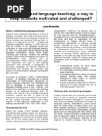 ensuring quality of literacy and cognitive development in L1 in the early years, partly re-orienting training of language teachers towards teaching of language for subject learning, starting CLIL only after some years of good initial L1-medium education, writing textbooks with L2-medium learners in mind doing small scale piloting of CLIL in a small number of schools to develop policy and practice scaling up the implementation of CLIL only when it can be seen to be working teaching only part of the curriculum one or two subjects in the L2. developing a national centre of expertise in teaching subjects through L2 in the countrys teacher education community, owned by subject teacher trainers not language specialists which would ensure that all relevant subject teacher preparation would be based on language-supportive pedagogy. being aware that schools in poorer neighbourhoods will have difficulties and support them accordingly. spending a lot of money on implementing CLIL giving yourself ten years for it to succeed. David Graddol, the author of English Next, also focuses on implementation as being key to the success of CLIL. He says there is a potentially large downside to it. In many countries they just dont seem to be equipped to implement CLIL. When it works, it works extraordinarily well, but it is actually quite difficult to do well. My feeling is that it may actually take 30 or 40 years for a country to really to pull this one off.(Graddol, 2005). This article has, I believe, shown that CLIL and ELT are very different, and that CLIL cannot be thought of as a way of teaching English. It is a subject in its own right, demanding particular skills of its teachers and particular conditions for success. References Ackerl, C. (2007) Lexico-grammar in the essays of CLIL and non-CLIL students: error analysis of written production VIEWZ, Vienna Working English Papers 16(3) 7 (www.univie.ac.at/anglistik/ang_new/online_papers/views.html) Baetens Beardmore, H. (2009) CLIL Symposium, IATEFL Conference, Cardiff, UK Clegg, J. (2009) Education through a second language: conditions for success CLIL Conference Proceedings Norwich Institute for Language Education 17