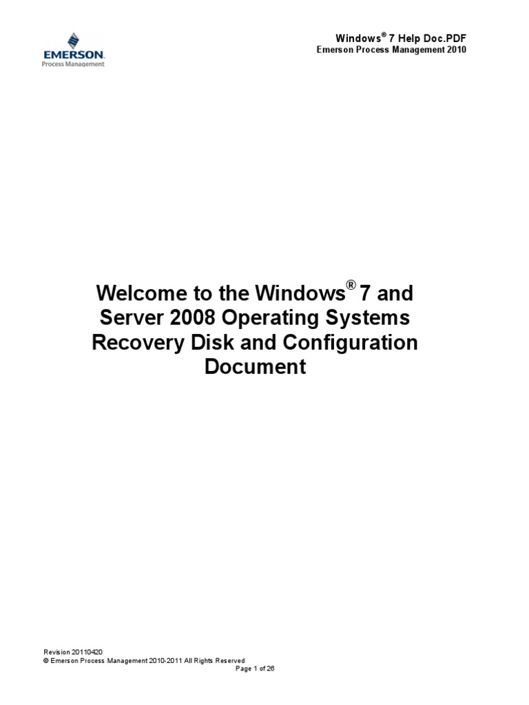 Because the recovery DVD quickly and easily recovers the operating system, it is not necessary to perform the manual steps of the past. Therefore, the Windows 7Help document does not provide step-by-step instructions on how to manually install the OS. Emerson Process Management will provide Windows 7 or Server 2008 OS Recovery DVDs for an approved list of hardware as defined by a list in Emersons KBA AK-10000068. Note: This list is updated with new PCs and servers added as they are released. Please read and understand all instructions before using the Recovery DVDs. This image recovery process will completely erase all data on your hard drive. It is important to understand the process before beginning.
