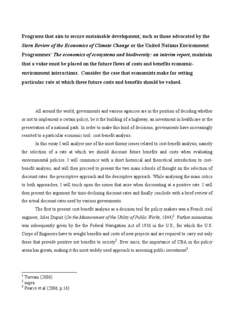 Change or the United Nations Environment Programmes The economics of ecosystems and biodiversity: an interim report, maintain that a value must be placed on the future flows of costs and benefits economicenvironment interactions. Consider the case that economists make for setting particular rate at which these future costs and benefits should be valued.