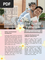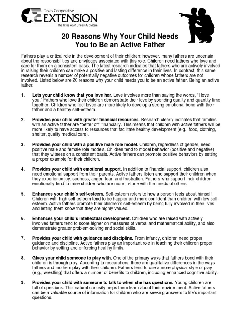 Fathers play a critical role in the development of their children; however, many fathers are uncertain about the responsibilities and privileges associated with this role. Children need fathers who love and care for them on a consistent basis. The latest research indicates that fathers who are actively involved in raising their children can make a positive and lasting difference in their lives. In contrast, this same research reveals a number of potentially negative outcomes for children whose fathers are not involved. Listed below are 20 reasons why your child needs you to be an active father. Being an active father: 1. Lets your child know that you love her. Love involves more than saying the words, I love you. Fathers who love their children demonstrate their love by spending quality and quantity time together. Children who feel loved are more likely to develop a strong emotional bond with their father and a healthy self-esteem. Provides your child with greater financial resources. Research clearly indicates that families with an active father are better off financially. This means that children with active fathers will be more likely to have access to resources that facilitate healthy development (e.g., food, clothing, shelter, quality medical care). Provides your child with a positive male role model. Children, regardless of gender, need positive male and female role models. Children tend to model behavior (positive and negative) that they witness on a consistent basis. Active fathers can promote positive behaviors by setting a proper example for their children. Provides your child with emotional support. In addition to financial support, children also need emotional support from their parents. Active fathers listen and support their children when they experience joy, sadness, anger, fear, and frustration. Fathers who support their children emotionally tend to raise children who are more in-tune with the needs of others. Enhances your childs self-esteem. Self-esteem refers to how a person feels about himself. Children with high self-esteem tend to be happier and more confident than children with low selfesteem. Active fathers promote their childrens self-esteem by being fully involved in their lives and letting them know that they are highly valued. Enhances your childs intellectual development. Children who are raised with actively involved fathers tend to score higher on measures of verbal and mathematical ability, and also demonstrate greater problem-solving and social skills. Provides your child with guidance and discipline. From infancy, children need proper guidance and discipline. Active fathers play an important role in teaching their children proper behavior by setting and enforcing healthy limits. Gives your child someone to play with. One of the primary ways that fathers bond with their children is through play. According to researchers, there are qualitative differences in the ways fathers and mothers play with their children. Fathers tend to use a more physical style of play (e.g., wrestling) that offers a number of benefits to children, including enhanced cognitive ability. Provides your child with someone to talk to when she has questions. Young children are full of questions. This natural curiosity helps them learn about their environment. Active fathers can be a valuable source of information for children who are seeking answers to lifes important questions.