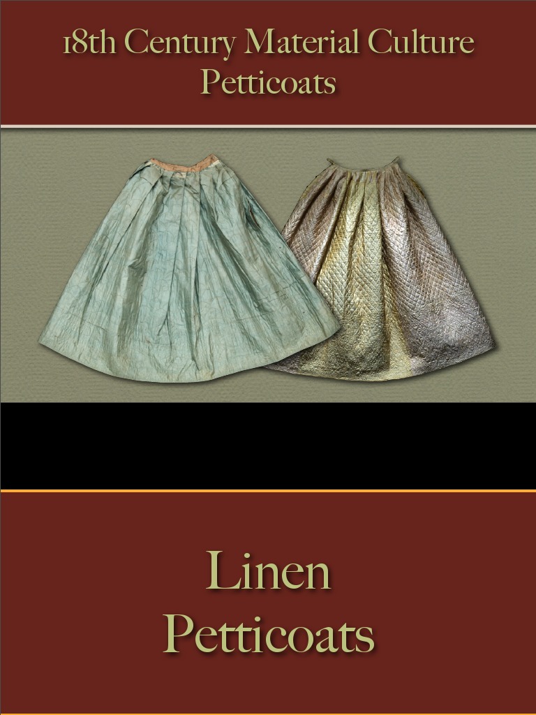 This document provides descriptions of over 100 petticoats from the 18th century held in museum and private collections in England, America, and France. The petticoats are categorized by material (linen, wool, cotton, silk), construction (quilted, embroidered), and country of origin (English, American, French, Dutch). Many include the museum or collection they are part of and estimated dates. The document concludes by acknowledging the organizations sharing their collections through online resources.
