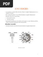 Figure 2. Quadrature Encoder A and B Output Signals In addition, some quadrature encoders include a third output channel called a zero or reference signal which supplies a single pulse per revolution. You can use this single pulse for precise determination of a reference position. In the majority of encoders, this signal is called the Z-Terminal or the index. So far, this document has addressed only what are called single-ended incremental quadrature encoders. These are called single-ended because the A and B signals are both referenced to ground, so there is one wire (or end) per signal. Another commonly used type of encoder is a differential encoder, where there are two lines per each A and B signal. The two lines for the A signal are A and A, and the two lines for the B signal are B and B. This type of configuration is also called push-pull because all four lines are always supplying a known voltage (either 0 V of V cc). When A is Vcc, A is 0 V , and when A is 0 V, A is V cc. In the case of a single-ended encoder, A is either V cc or it floats. Differential encoders are often used in electrically noisy environments because taking differential measurements protects the integrity of the signal. With incremental encoders, you can measure only changes in position (from which you can determine velocity and acceleration), but it is not possible to determine the absolute position of an object. A third type of encoder, called an absolute encoder, is capable of determining the absolute position of an object. This type of encoder has alternating opaque and transparent segments like the incremental encoder, but the absolute encoder uses multiple groups of segments that form concentric circles on the encoder wheel like a bulls-eye on a target or dartboard. The concentric circles start in the middle of the encoder wheel and, as the rings go out toward the outside of the ring, they each have double the number of segments than the previous inner ring. The first ring, which is the innermost ring, has one transparent and one opaque segment. The second ring out from the middle has two transparent and two opaque segments, and the third ring has four of each segment. If the encoder has 10 rings, its outermost ring has 512 segments, and if it has 16 rings, the outermost ring has 32,767 segments. Because each ring of the absolute encoder has double the number of segments of the prior ring, the values form numbers for a binary counting system. In this type of encoder, there is a light source and receiver for every ring on the encoder wheel. This means that the encoder with 10 rings has 10 sets of light sources and receivers, and the encoder with 16 rings has 16 light sources and receivers.