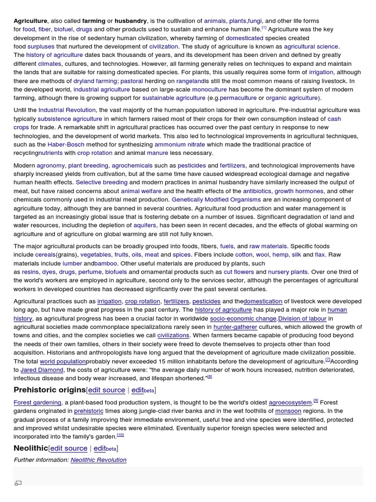 food, fiber, biofuel, drugs and other products used to sustain and enhance human life. Agriculture was the key development in the rise of sedentary human civilization, whereby farming of domesticated species created food surpluses that nurtured the development of civilization. The study of agriculture is known as agricultural science. The history of agriculture dates back thousands of years, and its development has been driven and defined by greatly different climates, cultures, and technologies. However, all farming generally relies on techniques to expand and maintain the lands that are suitable for raising domesticated species. For plants, this usually requires some form of irrigation, although there are methods of dryland farming; pastoral herding on rangelandis still the most common means of raising livestock. In the developed world, industrial agriculture based on large-scale monoculture has become the dominant system of modern farming, although there is growing support for sustainable agriculture ([Link] or organic agriculture). Until the Industrial Revolution, the vast majority of the human population labored in agriculture. Pre-industrial agriculture was typically subsistence agriculture in which farmers raised most of their crops for their own consumption instead of cash crops for trade. A remarkable shift in agricultural practices has occurred over the past century in response to new technologies, and the development of world markets. This also led to technological improvements in agricultural techniques, such as the Haber-Bosch method for synthesizing ammonium nitrate which made the traditional practice of recyclingnutrients with crop rotation and animal manure less necessary. Modern agronomy, plant breeding, agrochemicals such as pesticides and fertilizers, and technological improvements have sharply increased yields from cultivation, but at the same time have caused widespread ecological damage and negative human health effects. Selective breeding and modern practices in animal husbandry have similarly increased the output of meat, but have raised concerns about animal welfare and the health effects of the antibiotics, growth hormones, and other chemicals commonly used in industrial meat production. Genetically Modified Organisms are an increasing component of agriculture today, although they are banned in several countries. Agricultural food production and water management is targeted as an increasingly global issue that is fostering debate on a number of issues. Significant degradation of land and water resources, including the depletion of aquifers, has been seen in recent decades, and the effects of global warming on agriculture and of agriculture on global warming are still not fully known. The major agricultural products can be broadly grouped into foods, fibers, fuels, and raw materials. Specific foods include cereals(grains), vegetables, fruits, oils, meat and spices. Fibers include cotton, wool, hemp, silk and flax. Raw materials include lumber andbamboo. Other useful materials are produced by plants, such as resins, dyes, drugs, perfume, biofuels and ornamental products such as cut flowers and nursery plants. Over one third of the world's workers are employed in agriculture, second only to the services sector, although the percentages of agricultural workers in developed countries has decreased significantly over the past several centuries. Agricultural practices such as irrigation, crop rotation, fertilizers, pesticides and thedomestication of livestock were developed long ago, but have made great progress in the past century. The history of agriculture has played a major role in human history, as agricultural progress has been a crucial factor in worldwide socio-economic [Link] of labour in agricultural societies made commonplace specializations rarely seen in hunter-gatherer cultures, which allowed the growth of towns and cities, and the complex societies we call civilizations. When farmers became capable of producing food beyond the needs of their own families, others in their society were freed to devote themselves to projects other than food acquisition. Historians and anthropologists have long argued that the development of agriculture made civilization possible. [7] The total world populationprobably never exceeded 15 million inhabitants before the development of agriculture. According to Jared Diamond, the costs of agriculture were: "the average daily number of work hours increased, nutrition deteriorated, [8] infectious disease and body wear increased, and lifespan shortened."