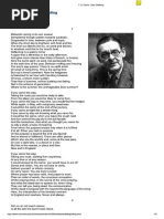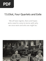 Water and fire succeed The town, the pasture and the weed. Water and fire deride The sacrifice that we denied. Water and fire shall rot The marred foundations we forgot, Of sanctuary and choir. This is the death of water and fire. In the uncertain hour before the morning Near the ending of interminable night At the recurrent end of the unending After the dark dove with the flickering tongue Had passed below the horizon of his homing While the dead leaves still rattled on like tin Over the asphalt where no other sound was Between three districts whence the smoke arose I met one walking, loitering and hurried As if blown towards me like the metal leaves Before the urban dawn wind unresisting. And as I fixed upon the down-turned face That pointed scrutiny with which we challenge The first-met stranger in the waning dusk I caught the sudden look of some dead master Whom I had known, forgotten, half recalled Both one and many; in the brown baked features The eyes of a familiar compound ghost Both intimate and unidentifiable. So I assumed a double part, and cried And heard another's voice cry: 'What! are you here?' Although we were not. I was still the same, Knowing myself yet being someone other And he a face still forming; yet the words sufficed To compel the recognition they preceded. And so, compliant to the common wind, Too strange to each other for misunderstanding, In concord at this intersection time Of meeting nowhere, no before and after, We trod the pavement in a dead patrol. I said: 'The wonder that I feel is easy, Yet ease is cause of wonder. Therefore speak: I may not comprehend, may not remember.' And he: 'I am not eager to rehearse My thoughts and theory which you have forgotten. These things have served their purpose: let them be. So with your own, and pray they be forgiven By others, as I pray you to forgive Both bad and good. Last season's fruit is eaten And the fullfed beast shall kick the empty pail.
