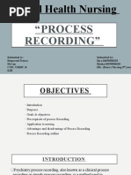 NUR 325 PSYCHIATRIC MENTAL HEALTH NURSING PROCESS RECORDINGS The process recording is a tool to help the student think objectively, logically and scientifically about interaction with clients. The objectives for this leaning exercise are to assist the student to: 1. Deliberately plan interaction in order to achieve the goals the student and the client have set up for the relationship. 2. Improve the students skill as a participant observer in nurse/client interactions. 3. Judge whether the responses the student uses are the most effective in helping the client define his problem and assist the client to solve problems. 4. Become more aware of how feelings affect the way the student responds and what affect the students behavior has on the patient. 5. Examine the students and the clients behavior in light of the theories and principles of the behavior sciences and psychiatric nursing. I. Introduce each process recording with a description of your thoughts and feelings prior to the interaction. Summarize the events that led up to the interaction. Describe the setting in which the interaction takes place. Identify what phase of the nurse/client relationship you are in, what tasks you are working on. Objectives for this interaction The purpose of identifying objectives for each interaction is to prompt thoughtful planning to advance the relationship and achieve expected client outcomes, there should be at least two (2) objectives for each interaction, one for yourself one for the client. The objectives should address the tasks of whichever phase of the nurse/client relationship the student is in. A. The objective for yourself will be based on your assessment of your own ability to relate to clients, what you think your problems are in this area, what skills you would like to develop or improve, e. g. if your client is very withdrawn and uncommunicative you may feel you need to increase your ability to tolerate long periods of silence. The objective for the client will be based on your initial and ongoing assessment. It may address problems that require nursing intervention or client resources that would be enhanced by nursing support and reinforcement.