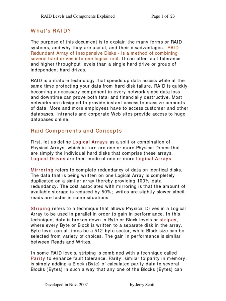 First, let us define Logical Arrays as a split or combination of Physical Arrays, which in turn are one or more Physical Drives that are simply the individual hard disks that comprise these arrays. Logical Drives are then made of one or more Logical Arrays. Mirroring refers to complete redundancy of data on identical disks. The data that is being written on one Logical Array is completely duplicated on a similar array thereby providing 100% data redundancy. The cost associated with mirroring is that the amount of available storage is reduced by 50%; writes are slightly slower albeit reads are faster in some situations. Striping refers to a technique that allows Physical Drives in a Logical Array to be used in parallel in order to gain in performance. In this technique, data is broken down in Byte or Block levels or stripes, where every Byte or Block is written to a separate disk in the array. Byte level can at times be a 512-byte sector, while Block size can be selected from variety of choices. The gain in performance is similar between Reads and Writes. In some RAID levels, striping is combined with a technique called Parity to enhance fault tolerance. Parity, similar to parity in memory, is simply adding a Block (Byte) of calculated parity data to several Blocks (Bytes) in such a way that any one of the Blocks (Bytes) can Developed in Nov. 2007 by Jerry Scott
