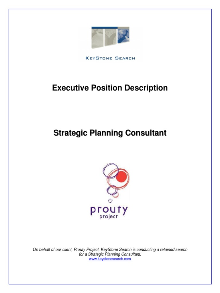The Strategic Planning Consultant will possess an undergraduate degree. A masters degree is desirable, but not a requirement. The successful candidate will have the background/potential to grow in the company--thinking strategically, keeping a keen eye on execution and results, and maintaining outstanding team member and customer relations. This individual will have a broad network of business and community contacts and style of building strong mutually beneficial relationships. With a passion for strategy, leadership and team development, the Strategic Planning Consultant will be able to articulate the services of the Prouty Project and bring new clients to the firm. This individual will be an exceptional communicator, able to share information easily in the C-suite and beyond. He or she will be a good listener and a capable public speaker. The Strategic Planning Consultant will have a global perspective; he or she will be committed to diversity and will respect the dignity of all people. Most importantly, the Strategic Planning Consultant will be energized and adaptable; they will enjoy their work and promote a spirit of fun!