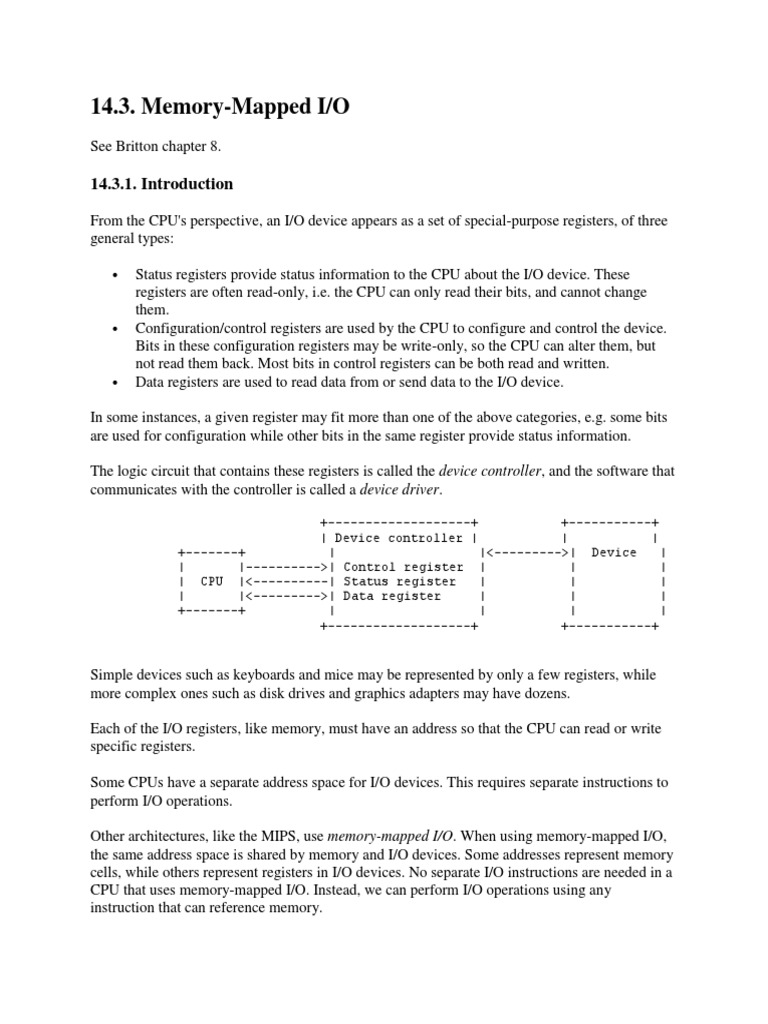 +-------------------+ +-----------+ | Device controller | | | +-------+ | |<--------->| Device | | |---------->| Control register | | | | CPU |<----------| Status register | | | | |<--------->| Data register | | | +-------+ | | | | +-------------------+ +-----------+