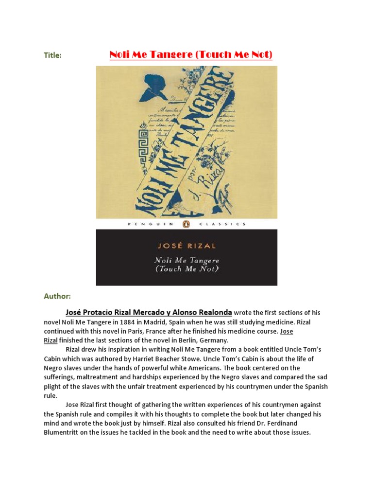 novel Noli Me Tangere in 1884 in Madrid, Spain when he was still studying medicine. Rizal continued with this novel in Paris, France after he finished his medicine course. Jose Rizal finished the last sections of the novel in Berlin, Germany. Rizal drew his inspiration in writing Noli Me Tangere from a book entitled Uncle Toms Cabin which was authored by Harriet Beacher Stowe. Uncle Toms Cabin is about the life of Negro slaves under the hands of powerful white Americans. The book centered on the sufferings, maltreatment and hardships experienced by the Negro slaves and compared the sad plight of the slaves with the unfair treatment experienced by his countrymen under the Spanish rule. Jose Rizal first thought of gathering the written experiences of his countrymen against the Spanish rule and compiles it with his thoughts to complete the book but later changed his mind and wrote the book just by himself. Rizal also consulted his friend Dr. Ferdinand Blumentritt on the issues he tackled in the book and the need to write about those issues.