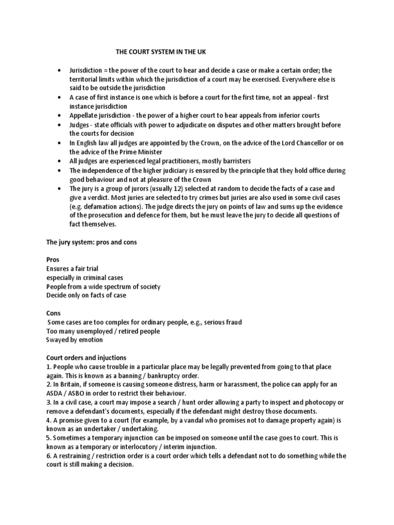The jury system: pros and cons Pros Ensures a fair trial especially in criminal cases People from a wide spectrum of society Decide only on facts of case Cons Some cases are too complex for ordinary people, e.g., serious fraud Too many unemployed / retired people Swayed by emotion Court orders and injuctions 1. People who cause trouble in a particular place may be legally prevented from going to that place again. This is known as a banning / bankruptcy order. 2. In Britain, if someone is causing someone distress, harm or harassment, the police can apply for an ASDA / ASBO in order to restrict their behaviour. 3. In a civil case, a court may impose a search / hunt order allowing a party to inspect and photocopy or remove a defendant's documents, especially if the defendant might destroy those documents. 4. A promise given to a court (for example, by a vandal who promises not to damage property again) is known as an undertaker / undertaking. 5. Sometimes a temporary injunction can be imposed on someone until the case goes to court. This is known as a temporary or interlocutory / interim injunction. 6. A restraining / restriction order is a court order which tells a defendant not to do something while the court is still making a decision.