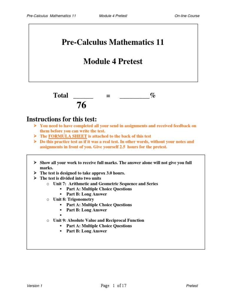You need to have completed all your send in assignments and received feedback on them before you can write the test. The FORMULA SHEET is attached to the back of this test Do this practice test as if it was a real test. In other words, without your notes and assignments in front of you. Give yourself 2.5 hours for the pretest. Show all your work to receive full marks. The answer alone will not give you full marks. The test is designed to take approx 3.0 hours. The test is divided into two units o Unit 7: Arithmetic and Geometric Sequence and Series Part A: Multiple Choice Questions Part B: Long Answer o Unit 8: Trigonometry Part A: Multiple Choice Questions Part B: Long Answer o Unit 9: Absolute Value and Reciprocal Function Part A: Multiple Choice Questions Part B: Long Answer