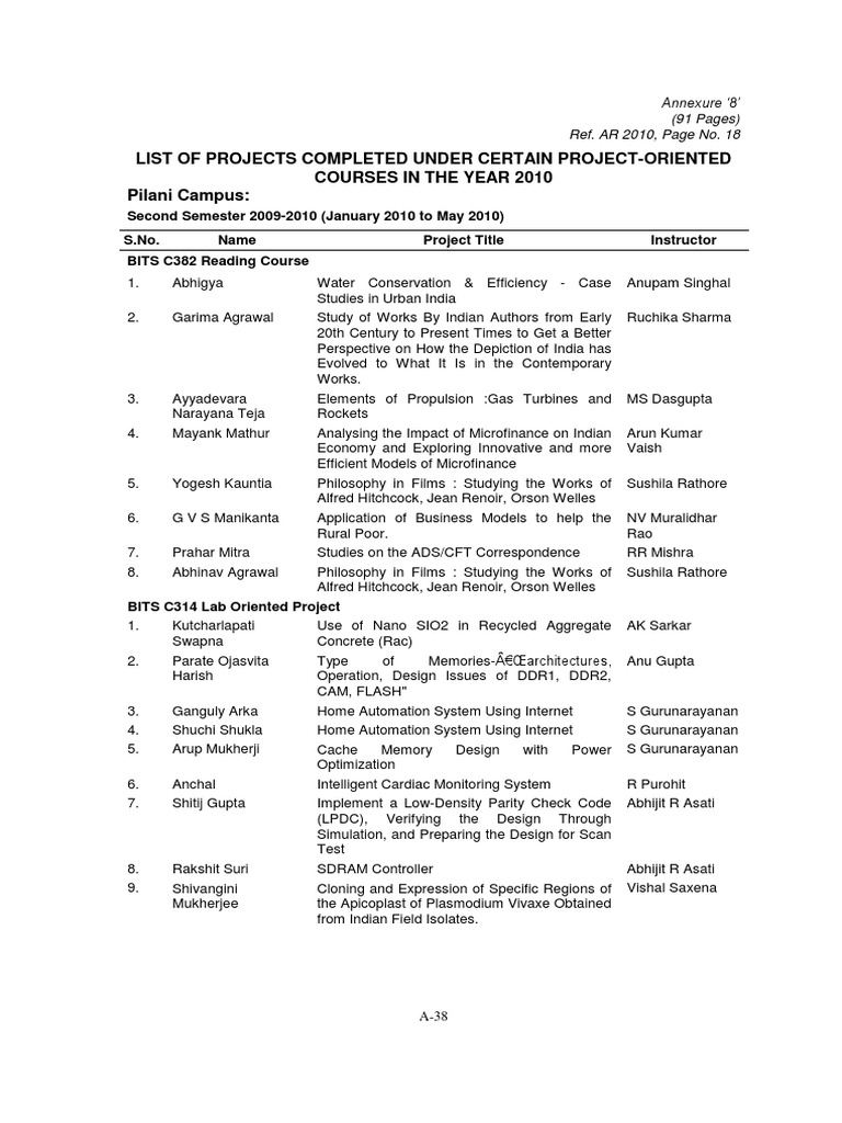 LIST OF PROJECTS COMPLETED UNDER CERTAIN PROJECT-ORIENTED COURSES IN THE YEAR 2010 Pilani Campus: