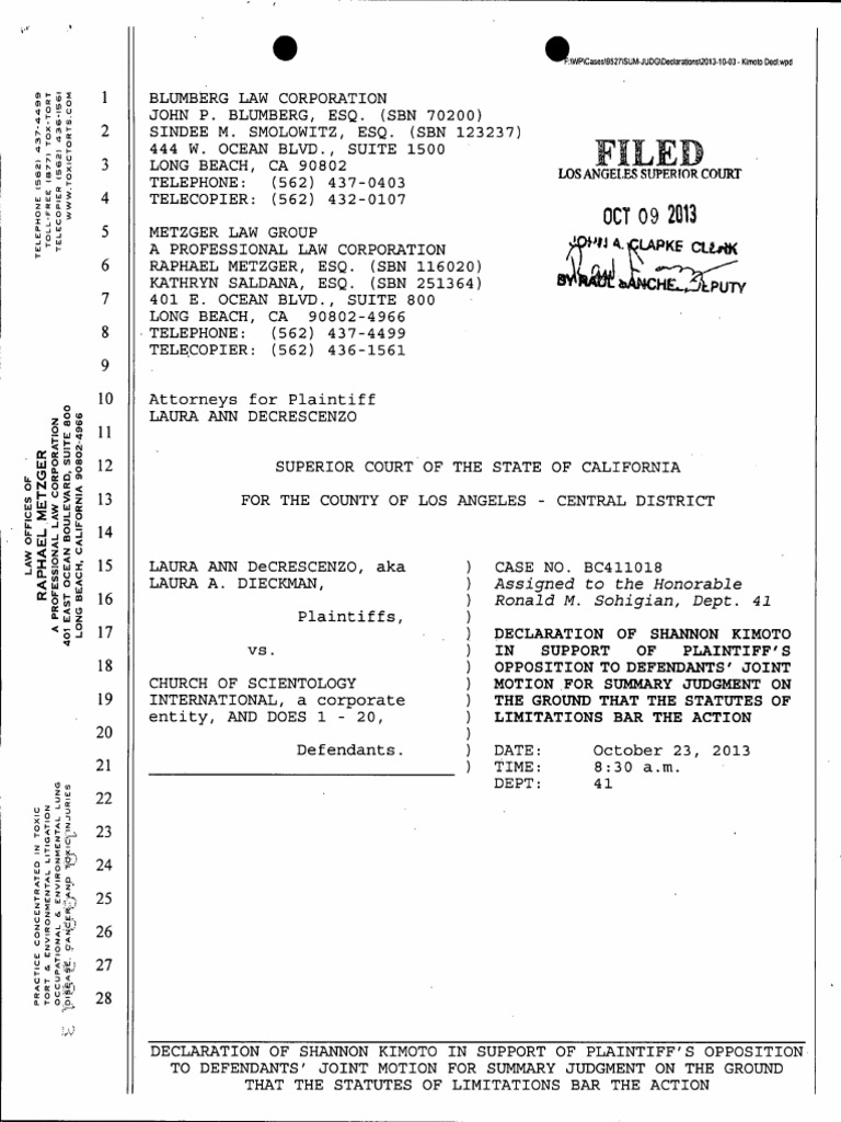 Shannon Kimoto's declaration in support of Laura DeCrescenzo's opposition to the Church of Scientology's motion for summary judgment.