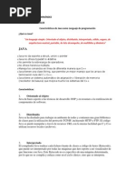 Caracterstica de java. Las caractersticas principalesque nos ofrece Java son: 1.- Lenguaje Simple: Se lo conoce como lenguaje simpleporque viene de la misma estructura de c y c++; ya que c++ fue un referentepara la creacin de java por eso utiliza determinadas caractersticas de c++ yse han eliminado otras. 2.- Orientado a Objeto: Toda la programacin en java ensu mayora est orientada a objeto, ya que al estar agrupados en estructurasenestructuras encapsuladas es ms fcil su manipulacin. 3.- Distribuido: Permite abrir sockets, establecery aceptar conexiones con los servidores o clientes remotos; facilita lacreacin de aplicaciones distribuidas ya que proporciona una coleccin declases para aplicaciones en red. 4.- Robusto: Es altamente fiable encomparacin con c, se han eliminadomuchas caractersticas con la aritmtica de punteros, proporciona numerosascomprobaciones en compilacin y en tiempo de ejecucin.