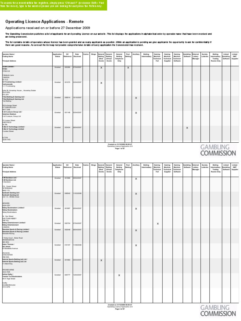 The Gambling Commission publishes a list of applicants for an Operating Licence on our website. This list displays the applications in alphabetical order by operator name that have been received and
