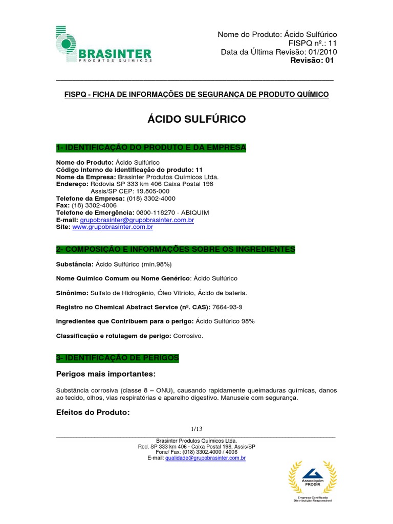 Nome do Produto: Ácido Sulfúrico Código interno de identificação do produto: 11 Nome da Empresa: Brasinter Produtos Químicos Ltda. Endereço: Rodovia SP 333 km 406 Caixa Postal 198 Assis/SP CEP: 19.805-000 Telefone da Empresa: (018) 3302-4000 Fax: (18) 3302-4006 Telefone de Emergência: 0800-118270 - ABIQUIM E-mail: grupobrasinter@grupobrasinter.com.br Site: www.grupobrasinter.com.br