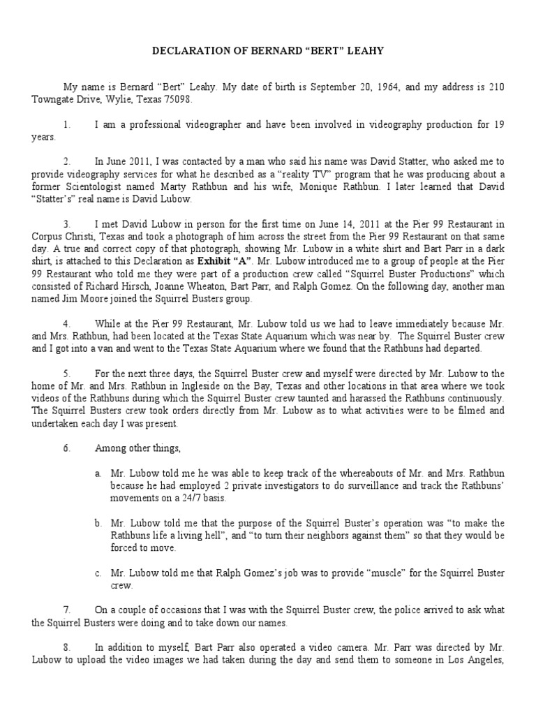 For the next three days, the Squirrel Buster crew and myself were directed by Mr. Lubow to the home of Mr. and Mrs. Rathbun in Ingleside on the Bay, Texas and other locations in that area where we took videos of the Rathbuns during which the Squirrel Buster crew taunted and harassed the Rathbuns continuously. The Squirrel Busters crew took orders directly from Mr. Lubow as to what activities were to be filmed and undertaken each day I was present. 6.