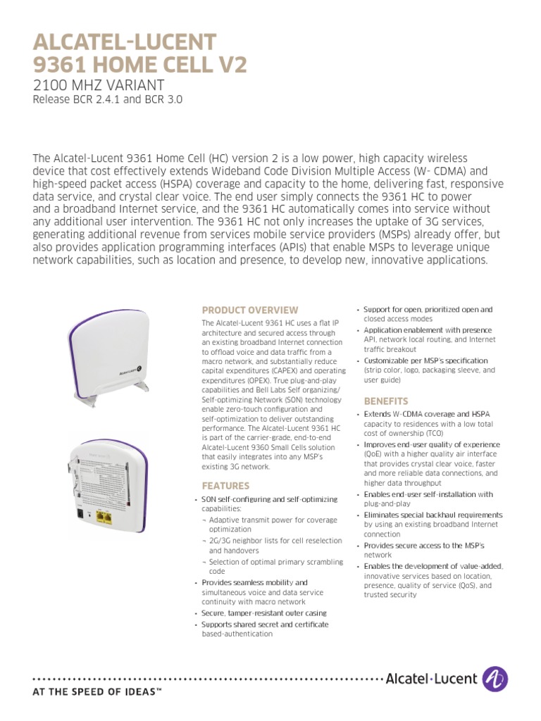 The Alcatel-Lucent 9361 Home Cell (HC) version 2 is a low power, high capacity wireless device that cost effectively extends Wideband Code Division Multiple Access (W- CDMA) and high-speed packet access (HSPA) coverage and capacity to the home, delivering fast, responsive data service, and crystal clear voice. The end user simply connects the 9361 HC to power and a broadband Internet service, and the 9361 HC automatically comes into service without any additional user intervention. The 9361 HC not only increases the uptake of 3G services, generating additional revenue from services mobile service providers (MSPs) already offer, but also provides application programming interfaces (APIs) that enable MSPs to leverage unique network capabilities, such as location and presence, to develop new, innovative applications.
