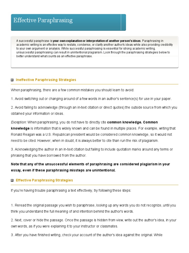 Ineffective Paraphrasing Strategies When paraphrasing, there are a few common mistakes you should learn to avoid: 1. Avoid switching out or changing around of a few words in an author's sentence(s) for use in your paper. 2. Avoid failing to acknowledge (through an in-text citation or direct quotes) the outside source from which you obtained your information or ideas. Exception: When paraphrasing, you do not have to directly cite common knowledge. Common knowledge is information that is widely known and can be found in multiple places. For example, writing that Ronald Reagan was a U.S. Republican president would be considered common knowledge, so it would not need to be cited. However, when in doubt, it is always better to cite than run the risk of plagiarism. 3. Acknowledging the author in an in-text citation but failing to include quotation marks around any terms or phrasing that you have borrowed from the author. Note that any of the unsuccessful elements of paraphrasing are considered plagiarism in your essay, even if these paraphrasing missteps are unintentional. Effective Paraphrasing Strategies If youre having trouble paraphrasing a text effectively, try following these steps: