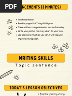 In this topic sentence, the essayist is arguing that physical bonds of friendship, specifically, make the female characters more self-aware. Because this idea can be refuted or supported by readers (based on how successfully the essayist persuades his or her readers with examples and analysis from the novel), and because the claim is narrow enough to address within a single paragraph, the above sentence is a successful topic sentence. Direct Quotations (Are Best Avoided) Although it might be tempting to begin a paragraph with a compelling quotation, as a general rule, topic sentences should state the main idea of the paragraph in your own words. Direct quotations have a place later in the paragraph, where they may be incorporated to support the topic sentence. Needs Improvement: As Morrison (1982) conveyed, the girls friendship "let them use each other to grow onthey found in each other's eyes the intimacy they were looking for" (p. 52). Better: In the novel Sula , Morrison uses the physical bonds of female friendship to propel her characters into self-awareness. Pointing to the connection of eyes meeting and bodies growing together, Morrison makes coming-of-age an interactive physical process between the adolescent protagonists. Specifically, Morrison describes how Sula and Nel have used "each other to grow on they found in each other's eyes the intimacy they were looking for" (p. 52). In this second paragraph, the topic sentence appears first, immediately orienting readers to the main focus (or topic) of the paragraph. The quotation is used later in the paragraph as a form of evidence or support for the topic sentence. Extra Tips If you are finding it challenging to create effective topic sentences, you might consider outlining before beginning to write a paper. The points and subpoints of an outline can then become the topic sentences for the paper's paragraphs. Additionally, because the topic sentence functions similarly at the paragraph level to the thesis at the essay level, you may also find it helpful to check out our thesis statement construction information. Our resource on paragraphs has helpful information about the scope of a paragraph, as well.