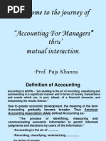 ACCOUNTING Accounting is concerned with the process of recording, classifying and summarising data resulting form business operations and events. According to American Accounting Association accounting is the process of identifying, measuring and communicating economic information to permit informed judgements and decision by users of the information. The definition given by the (AICPA) American institute of Certified Public Accountants clearly brings out the meaning and functions of accounting. According to it accounting is the art of recording, classifying and summarising in a significant manner and in terms of money, Transactions and events which are in part, at least, of a finance character and interpreting the results thereof. The General Equation of Accounting Assets = Liabilities + Owners Equity GAAP Generally Accepted Accounting principles .A widely accepted set of rules, conventions, standards, and procedures for reporting financial information, as established by the Financial Accounting standards Board (FASB). GAAP PRINCIPLES: The common set of principles, standards and procedures that companies use to compile their financial statement. GAAP are a combination of authoritative standards (set by policy boards) and simply the commonly accepted ways of recording and reporting accounting information Advantages of Accounting: The present Global economic world the Accounting process has the following advantages. 1. Provides information for Systematic records: Since all the financial transactions are recorded in the books, one need not rely on memory. Any information required is readily available from these records. 2. Facilitates the preparation for financial statements: Profit and loss account and balance sheet can be easily prepared with the help of the information in the records. This enables the trader to know the net result of business operations.( i.e profit / loss) during the accounting period and the financial position of the business at the end of the accounting period. 3. Provides the control over Assets: Book keeping provides the information regarding cash in hand, cash at bank, stock of goods, accounts receivable from various parties and the accounts invested in various other assets. As the trader knows the values of the assets he will have control overt them. 4. Provides the required information: Interested parties such as owners. Lenders, creditors etc.. Get necessary information at frequent intervals. 5. Comparative Study: One can compare the present performance of the organisation with that of its past. This enables the managers to draw useful conclusions and make proper decisions. 6. Tax matters: Properly maintained book-keeping records will help in the settlement of all tax matters with the tax authorities. 7. Helpful to management: Accounting is useful to the management In many ways. It enables the management to assess the achievement of its performance. The weaknesses of the business can be identified and corrective measurements can be applied to remove them with the help of accounting.